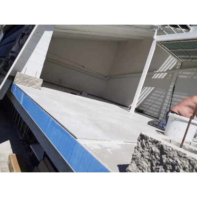 Terasa s lepenou keramickou dlažbou se schody, okapnicí a soklem. Realizace včetně hydroizolace.