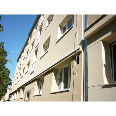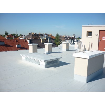 Rekonstrukce střechy BD Biskupcova. Realizovaná do hydroizolační PVC fólie.